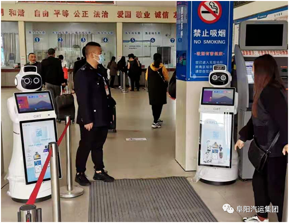 “體溫正常”,“您好,有什么可以幫您?”在阜陽汽車東站候車室內,智能機器人正站在售票大廳入口處認真工作。